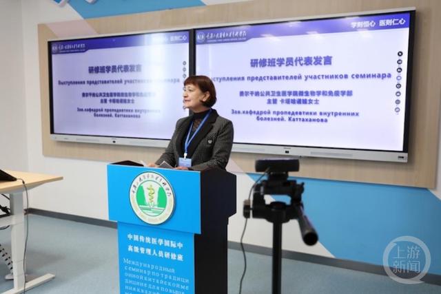 來自烏茲別克斯坦費爾干納公共衛生醫學院的卡塔哈諾娃女士代表參訓學員發言。她表達了對參加此次研修班的喜悅之情,希望通過本次研修班學習,進一步了解中醫藥的發展,學習中醫藥的相關知識。同時期望學院能在人才培養、科學研究、教師培訓等方面與中方開展進一步合作,為“一帶一路”國際合作貢獻力量。