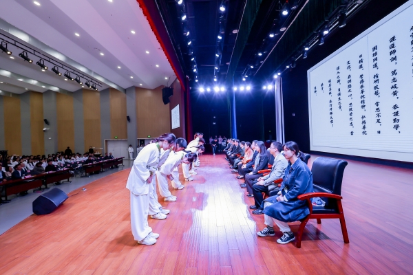 軒岐古道,薪火綿延,杏林業隆,道有其傳。伴隨著熱烈的掌聲,拜師儀式正式開始。主持人吳勁松老師和“華佗菁英班”導師代表領誦《師訓》,告誡學生“每方每藥,皆系性命;一針一灸,關乎生死。故醫者,德于技先,技承德滿;德要近佛,才欲近仙。心不可不仁,業不可不精?!薄叭A佗菁英班”導師代表和學生代表,依次互呈拜師帖、回徒帖。導師將中醫經典書籍裝入特別設計的“華佗青囊”里,寓意將精誠品德和知識技藝“傾囊而授”,希望弟子們“誦大醫精誠而存萬世之本,揚華佗精神而達德技雙馨”。