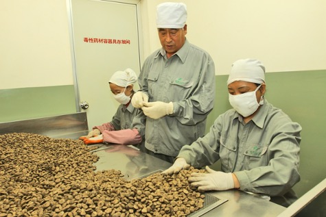 第五代傳承人任紹學(中)指導工人篩選馬錢子