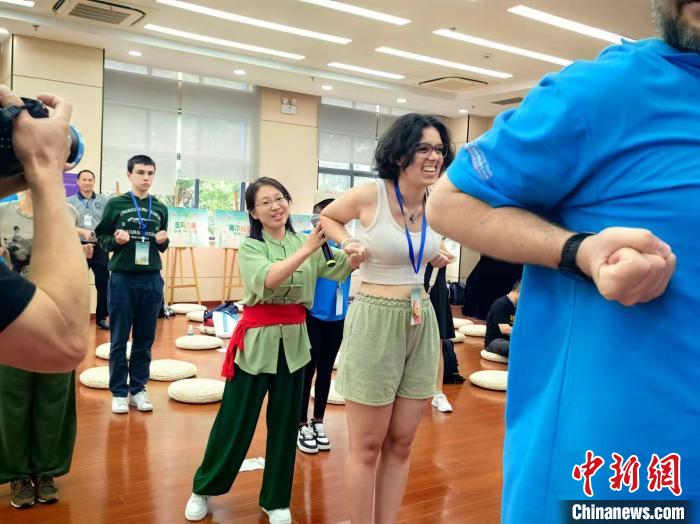 當日,在上海傳承導引醫學研究所的嚴石卿家庭帶領下,中外營員們凝神定氣,打起了易筋經功法。動靜之間,青年們在舒緩延綿的動作中感悟中華養生的內涵。剛剛做完易筋經功法的突尼斯女孩 Yosr Fourati說,感覺身體輕快,很放松。