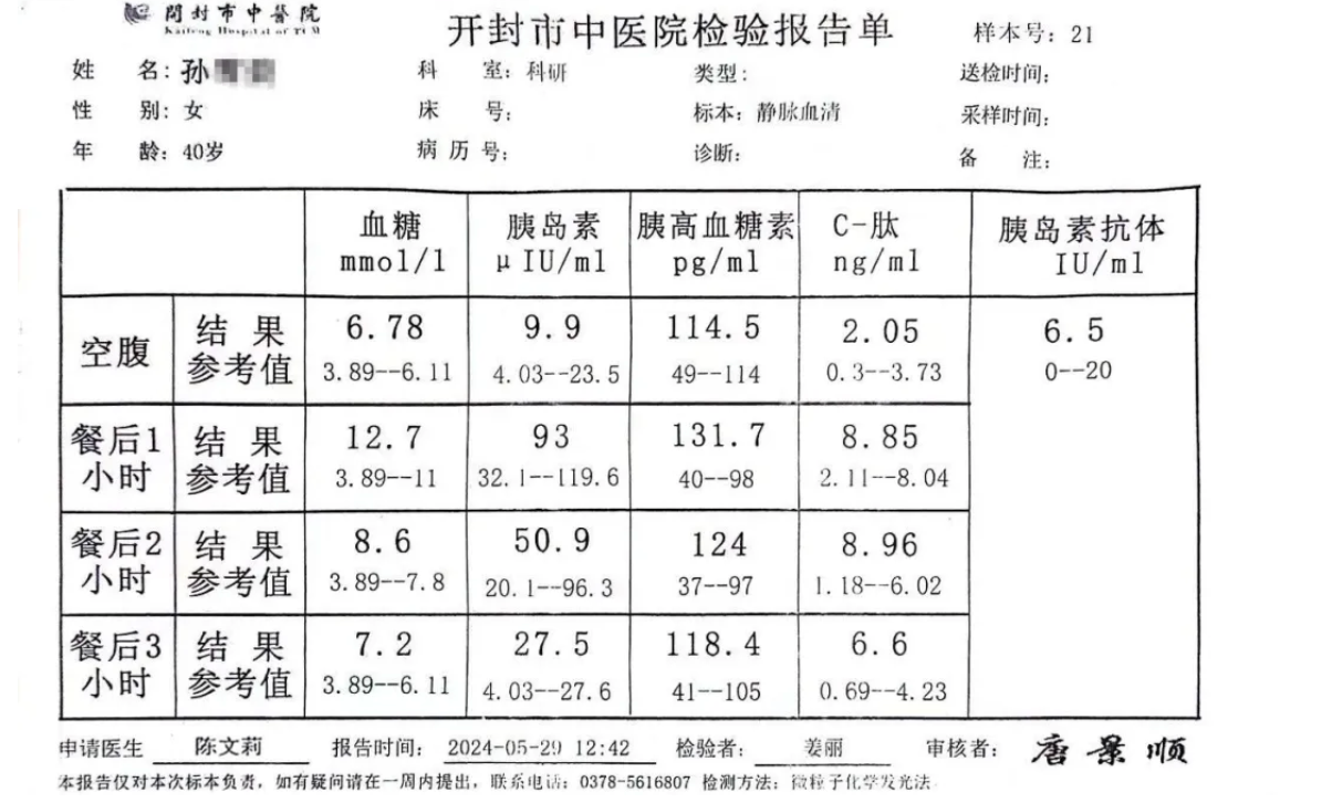 停藥8個月(2024年5月29日)復診,孫女士空腹血糖6.78mmol/L,餐后2h血糖8.6mmol/L,糖化血紅蛋白6.2%,達到逆轉標準。結合檢查結果,陳文莉大夫囑咐孫女士繼續保持良好的生活習慣,定期監測血糖變化。