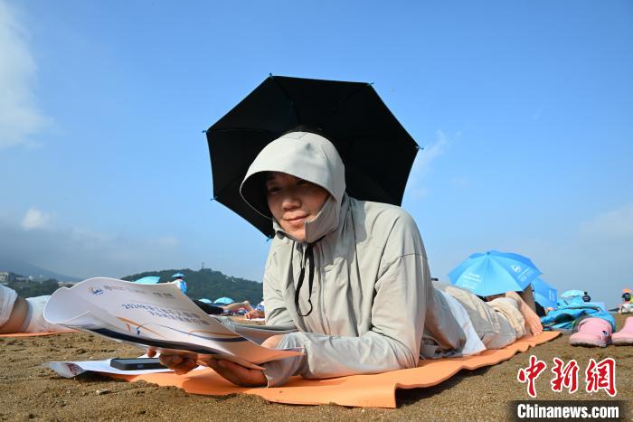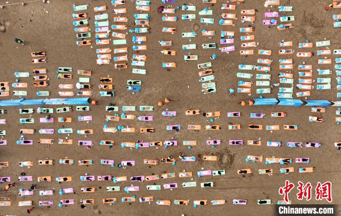雙手支撐雙腿屈膝的伏體動作、雙臂舒展單腿平伸的展體動作、雙腿盤坐雙手合十的坐姿動作……授課及曬背過程近30分鐘,上千人鋪開五顏六色的瑜伽墊,以各種姿勢開展天灸曬背,將漁寮沙灘點綴成海邊的一道彩虹。