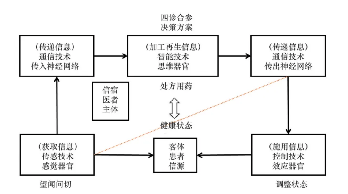 中醫為了實現維護健康的目標,巧妙地利用了人的信息器官,采用最基本的“觀察”與“干擾”法,和原始的“信息技術”構建了“干預、反饋、調整”的技術體系,實現了“天人合一”維護健康的目標。從圖4可以看到,中醫的診療過程實際上是信息感測、通信、智能和控制技術在醫療行為中的體現。感知技術是醫生利用自身的感覺器官通過望聞問切來感知患者臨床表現的過程,通信技術是醫生將四診獲得的信息通過神經系統傳遞給大腦的過程;智能技術是醫生通過大腦“四診合參、知性思維、辯證思維”等進行信息加工,再產生出決策方案即處方用藥的過程;患者利用自身的調控功能,實施醫者提出的干預方案則是一個施用信息的過程。其后醫者再根據干預后患者健康狀態的變化,重復以上過程,調整方案,最終達到外在干預與人體健康狀態的相合,實現維護健康的目的。在這些過程中,醫者主體與患者客體互動共情,始終以療效為導向、以解決患者健康問題為驅動,充分利用了人的感覺器官、信息技術實現了信息轉換,在不知道干預與疾病的物質本源的情況下,卻解決了健康維護這一難題。