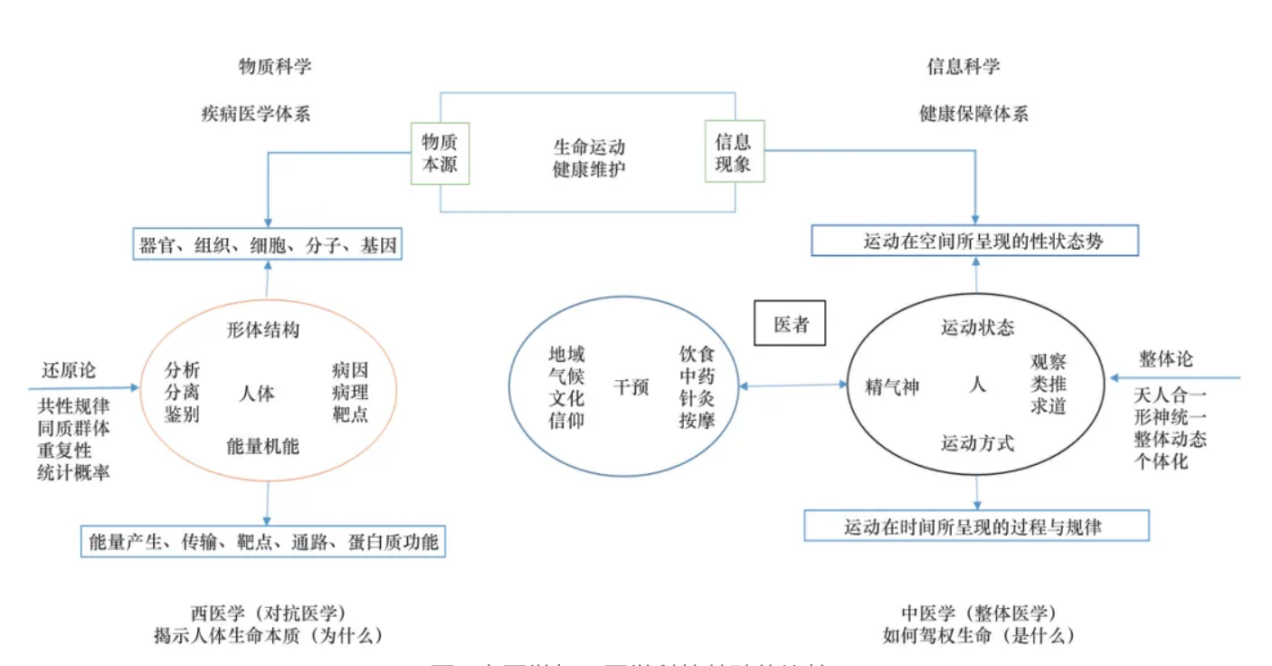 文藝復興以來的工業革命及其支撐的科技,從物質觀點出發,緊緊抓住事物運動的本源,在分析分離鑒別技術不斷革新的支撐下,以發現新的知識為導向,形成了其價值標準和推進的競爭機制,在認識事物物質構成與功能,并以此來改造世界中取得了巨大的進步;而信息科學所面對的是一個內外交互和開放的復雜巨系統,隨著研究深化,受信息獲取、傳輸以及海量數據處理能力的制約,所以在很長一段時間內信息科學的成就并不顯著。20世紀以來,隨著感測、通信、微電子技術和計算機、互聯網、人工智能等信息技術的快速發展,以及“第三范式——仿真范式”向“第四范式——數據密集型范式”的轉換,人類獲取、管理和處理數據的能力發生了革命性的變革。21世紀以來,社會已經全面進入信息時代,以第五代移動通信技術(5G)、人工智能、區塊鏈、大數據等信息技術為代表的新一輪科技革命和產業變革加速推進,成為推動經濟社會發展的主要動能,整個世界已經開始數字化轉型;與之相適應的價值觀、方法論、運作機制都在進行大的變革和調整,作為以信息科學為主要支撐的領域將迎來發展的春天。物質科學與信息科學2種不同的科學類別及其科研范式,也淋漓盡致地反映在人類健康維護中。