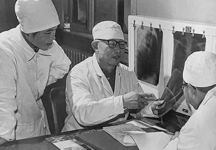 1980年1月16日 中日友好醫院首任院長辛育齡(中)在內蒙古結核病院與胸外科醫師討論病例(翻拍照片)