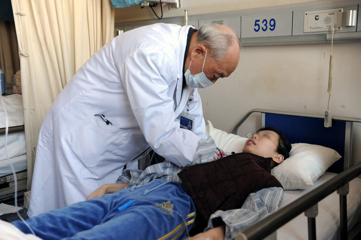 瑞金醫院終身教授王振義在上海瑞金醫院為病人看?。ㄙY料照片)