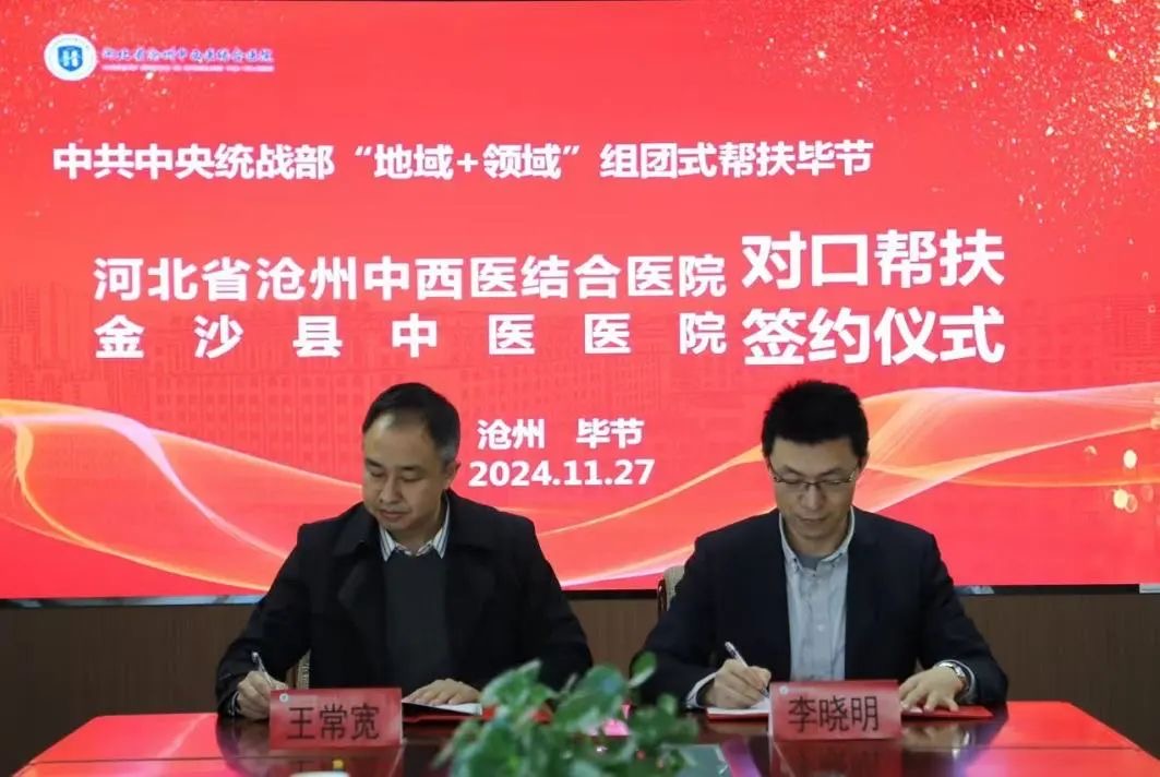 當日下午,滄州中西醫結合醫院與金沙縣中醫醫院的對口幫扶協議簽訂儀式在本部院區舉行,李曉明院長與王常寬院長代表雙方簽署協議。根據協議,在未來三年內,雙方將在學科建設、人才培養、文化建設和醫院管理等多個領域開展深入合作。