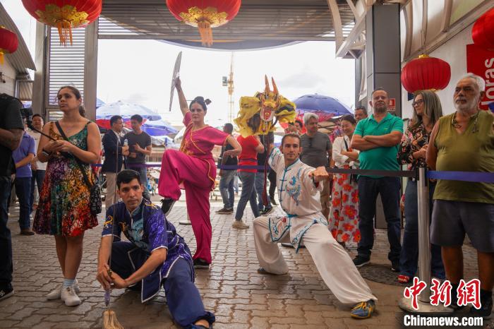 這是慶祝元宵活動第二次走進巴西利亞進口商品市場。巴西戈亞斯聯邦大學中醫孔子學院教師秦佳碩將雙節棍舞得虎虎生威,師生們還現場施展推拿針灸絕活,備受巴西民眾歡迎。
