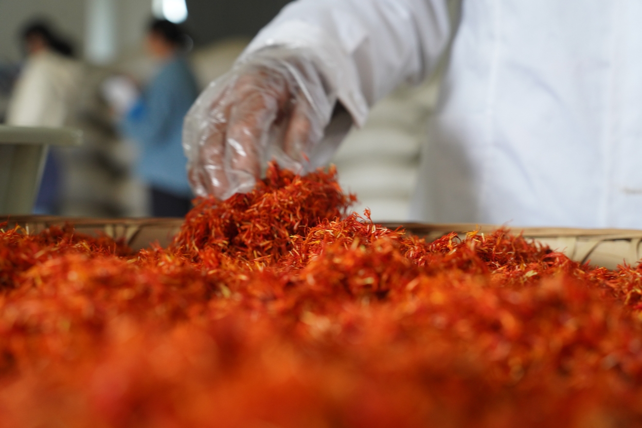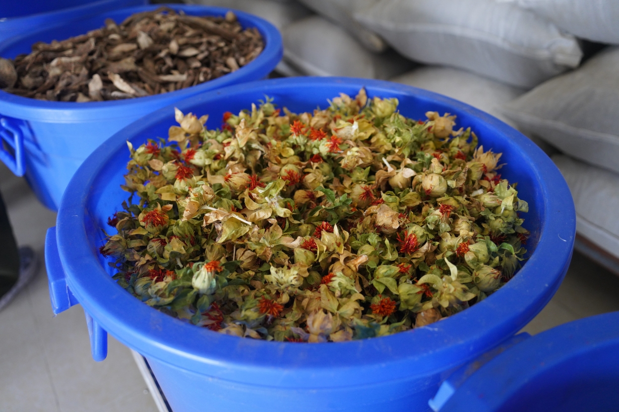 ▲在曲松鎮瓊嘎村藏藥材種植加工專業合作社,生產車間里的草紅花原料。中國網記者胡俊攝